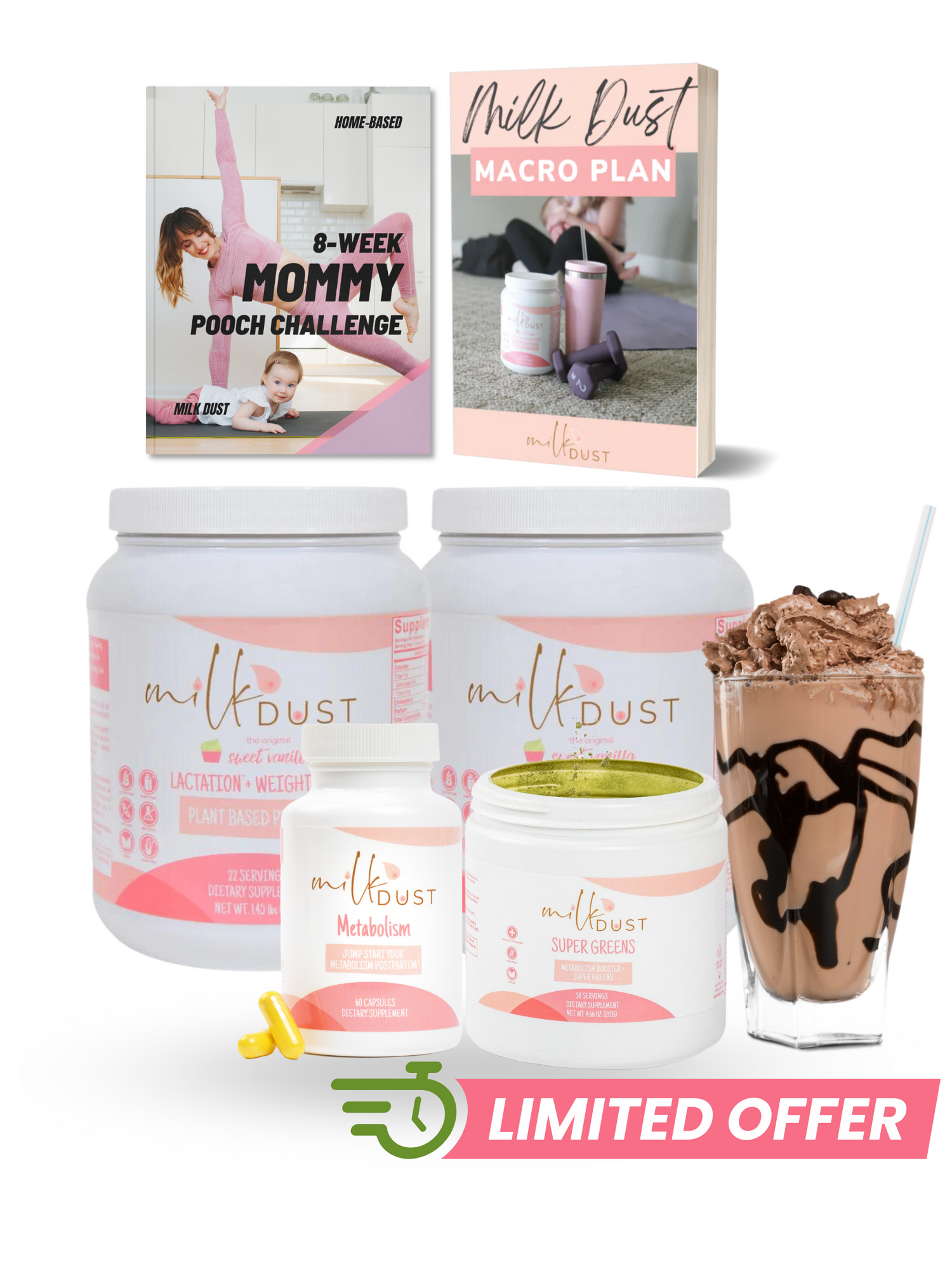 - 2 jars each Milk Dust Lactation Protein Powder.2 Bottles Milk Dust Metabolism to help burn fat and boost postpartum metabolic rate